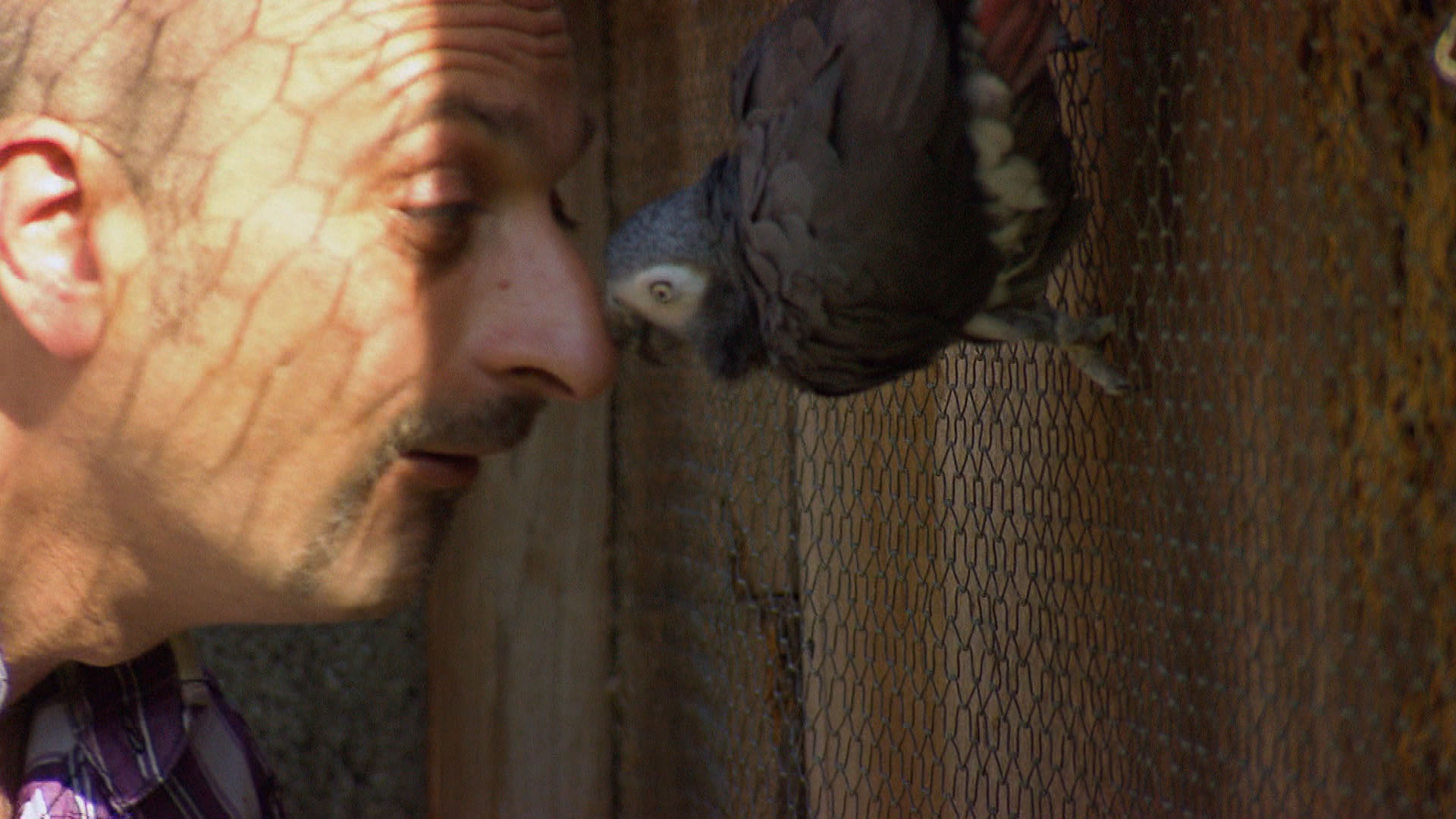Bei den Papageien herrscht Hochstimmung, Mario Romano ist da: Er ist der Papageien-Psychologe der Station, ein echter „Vogelflüsterer“. Heute kümmert er sich um „Theo“ – der Papagei saß 20 Jahre alleine in einem Käfig und leidet jetzt unter schweren Angststörungen.